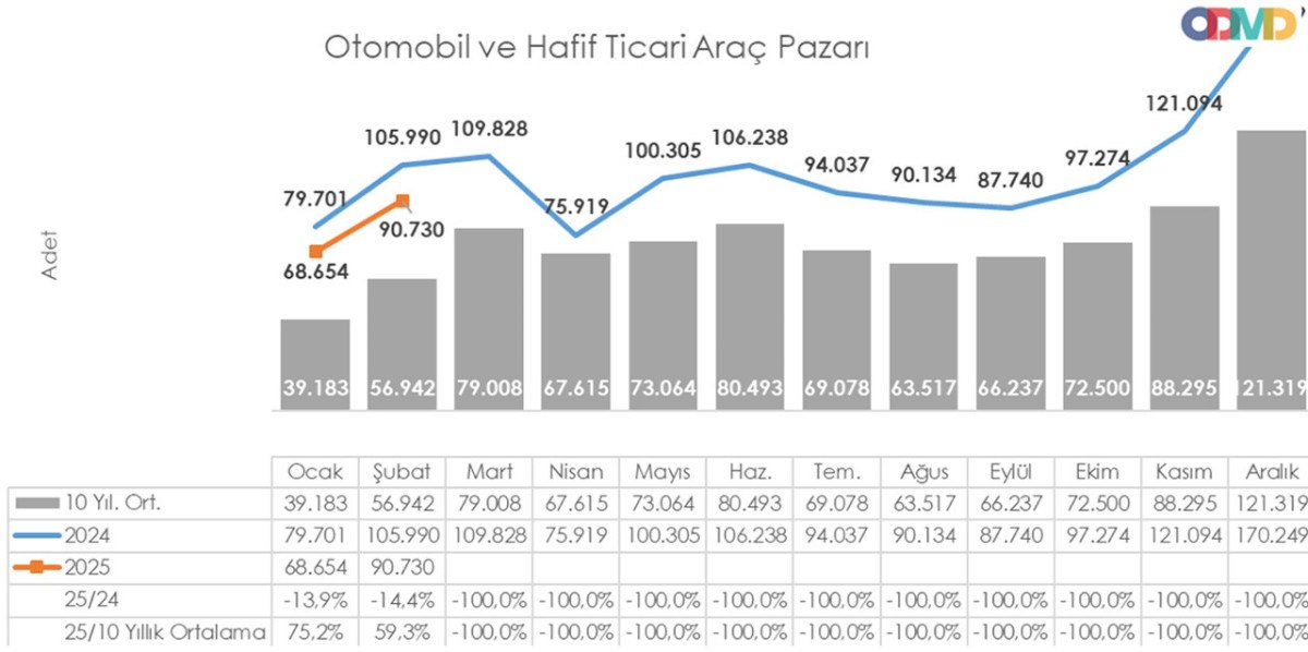 2025 yılı Ocak-Şubat döneminde de otomobil ve hafif ticari araç satışlarında bir düşüş yaşandı. Satışlar, geçen yılın aynı dönemine göre %14,2 oranında azalarak 159 bin 384 adede geriledi. Otomobil satışları, %9,8 düşüşle 131 bin 965 adet olarak kaydedilirken, hafif ticari araç pazarı %30,4 oranında bir daralma yaşayarak 27 bin 419 adede indi.